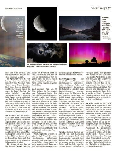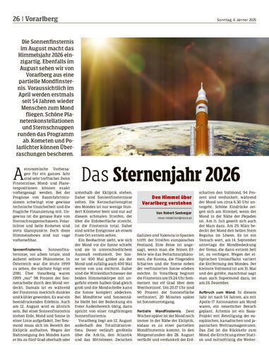 Die Sonnenfinsternis im August macht das Himmelsjahr 2026 einzigartig. Ebenfalls im August sehen wir von Vorarlberg aus eine partielle Mondfinsternis. Voraussichtlich im April werden erstmals seit 54 Jahren wieder Menschen zum Mond fliegen. Schöne Planetenkonstellationen und Sternschnuppen runden das Programm ab. Kometen und Polarlichter können Überraschungen bescheren.