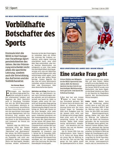 Erstmals kürt die NEUE in fünf Kategorien Vorarlbergs Sportpersönlichkeiten des Jahres. Bei der Prämierung entscheidet nicht allein die sportliche Leistung, sondern auch die Entwicklung, das Auftreten und der Vorbildcharakter.