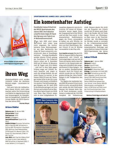 Handballer Lukas Fritsch ist der NEUE-Sportsmann des Jahres 2025. Der Fußacher schaffte beim Alpla HC Hard den Sprung vom Talent zur A-Nationalmannschaft.