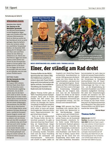 Thomas Kofler ist der NEUE-Sportmacher des Jahres 2025. Der Feldkircher schaffte es erneut, dass sein Team Vorarlberg auch international an der Spitze mitfuhr. Und etablierte Vorarlberg als Standort von Radevents der Extraklasse.