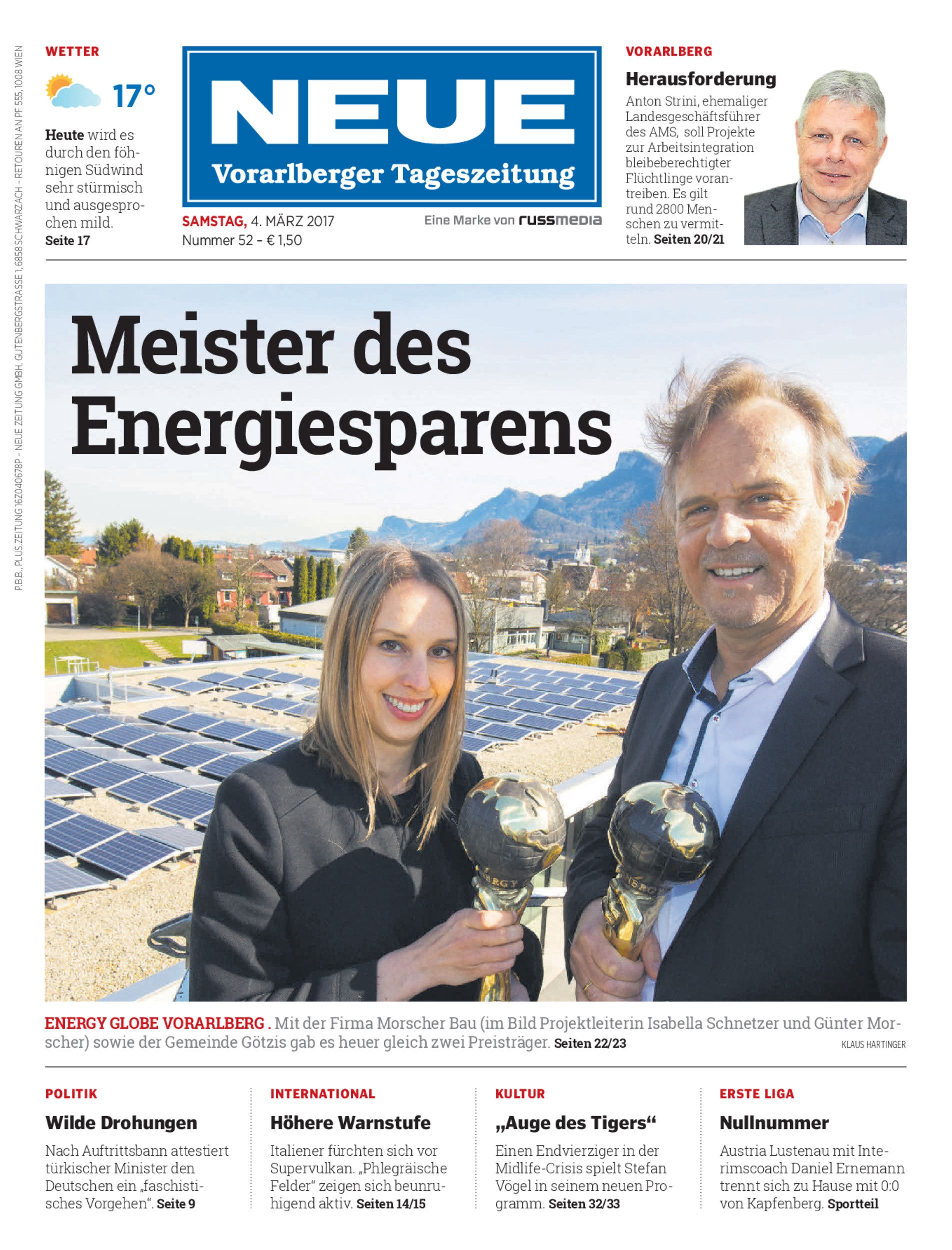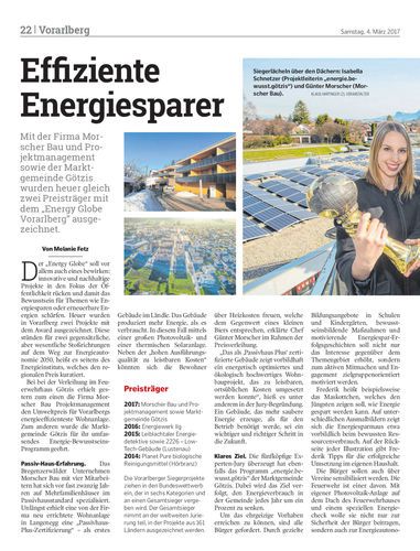 Mit der Firma Morscher Bau und Projektmanagement sowie der Marktgemeinde Götzis wurden heuer gleich zwei Preisträger mit dem „Energy Globe Vorarlberg“ ausgezeichnet.