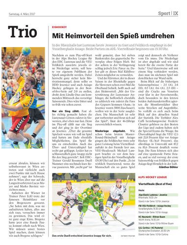In der Rheinhalle hat Lustenau heute Jesenice zu Gast und Feldkirch empfängt in der Vorarlberghalle Asiago. Beide Partien im AHL-Viertelfinale beginnen um 19.30 Uhr.