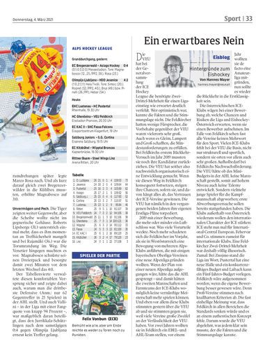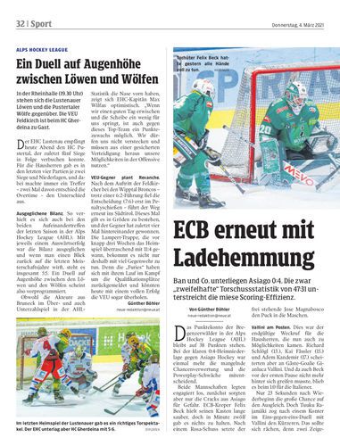 In der Rheinhalle (19.30 Uhr) stehen sich die Lustenauer Löwen und die Pustertaler Wölfe gegenüber. Die VEU Feldkirch ist beim HC Gherdeina zu Gast.