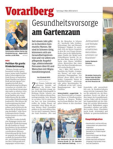 Seit einem Jahr gibt es in Dornbirn Community Nurses. Sie sind in Schoren tätig, kümmern sich um Gesundheitsprävention und vor allem um pflegende Angehörige, alleinstehende Personen über 65 und Menschen mit Migrationshintergrund.