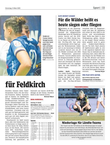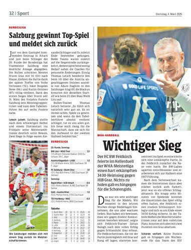Der HC BW Feldkirch feierte im Kellerduell der WHA-Meisterliga einen hart erkämpften 34:30-Heimsieg gegen HIB Graz. Nichts zu holen gab es hingegen für die Schorengirls.