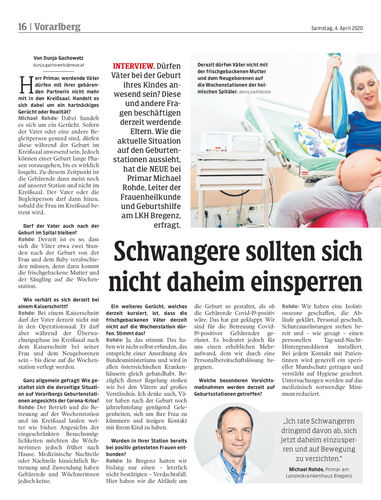Interview. Dürfen Väter bei der Geburt ihres Kindes anwesend sein? Diese und andere Fragen beschäftigen derzeit werdende Eltern. Wie die aktuelle Situation auf den Geburtenstationen aussieht, hat die NEUE bei Primar Michael Rohde, Leiter der Frauenheilkunde und Geburtshilfe am LKH Bregenz, erfragt.