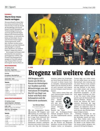 SW Bregenz trifft heute um 18 Uhr zu Hause im immoAgentur-Stadion auf den Mitaufsteiger aus der Vorsaison SV Stripfing. Die Elf von Regi van Acker will Platz drei behaupten und die Heimserie ausbauen.
