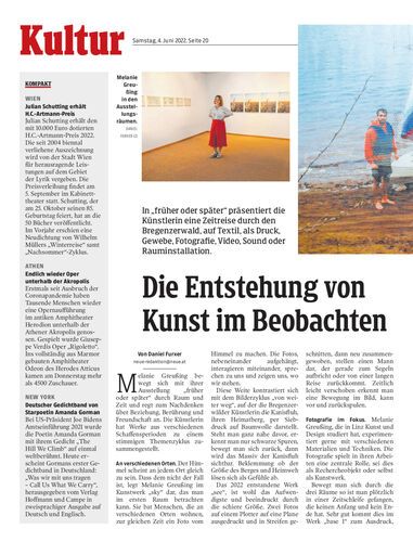 In „früher oder später“ präsentiert die Künstlerin eine Zeitreise durch den Bregenzerwald, auf Textil, als Druck, Gewebe, Fotografie, Video, Sound oder Rauminstallation.