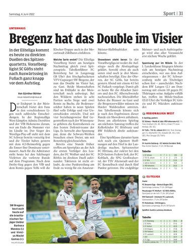 In der Eliteliga kommt es heute zu direkten Duellen des Spitzenquartetts. Vorarlbergligist SC Göfis steht nach Auswärtssieg in Fußach ganz knapp vor dem Aufstieg.