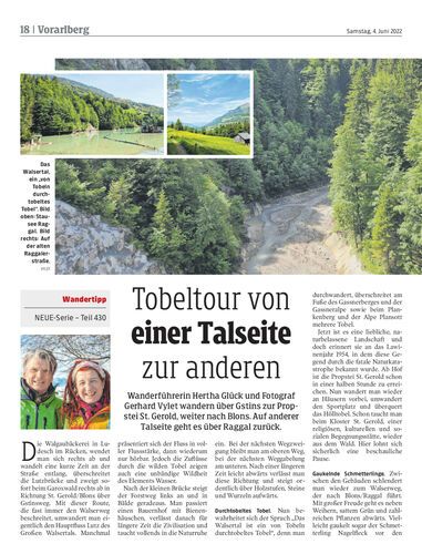 Wanderführerin Hertha Glück und Fotograf Gerhard Vylet wandern über Gstins zur Propstei St. Gerold, weiter nach Blons. Auf anderer Talseite geht es über Raggal zurück.