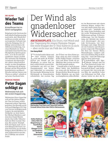 am schauplatz. Ein Sturz, viel Wind und der Tagessieg für einen Olympia-Sieger. Die erste Etappe der Ö-Tour hatte es in sich – aber nicht nur im Feld der 141 Profis. Von Georg Michl
