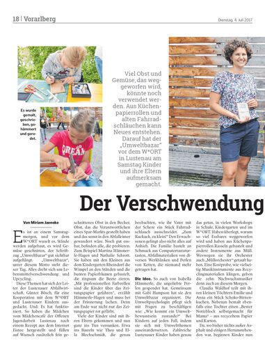 Viel Obst und Gemüse, das weggeworfen wird, könnte noch verwendet werden. Aus Küchenpapierrollen und alten Fahrradschläuchen kann Neues entstehen. Darauf hat der „Umweltbazar“ vor dem W*ORT in Lustenau am Samstag Kinder und ihre Eltern aufmerksam gemacht.