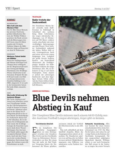 Die Cineplexx Blue Devils müssen nach einem 64:63-Erfolg aus der Austrian Football League absteigen, Ärger gibt es keinen.