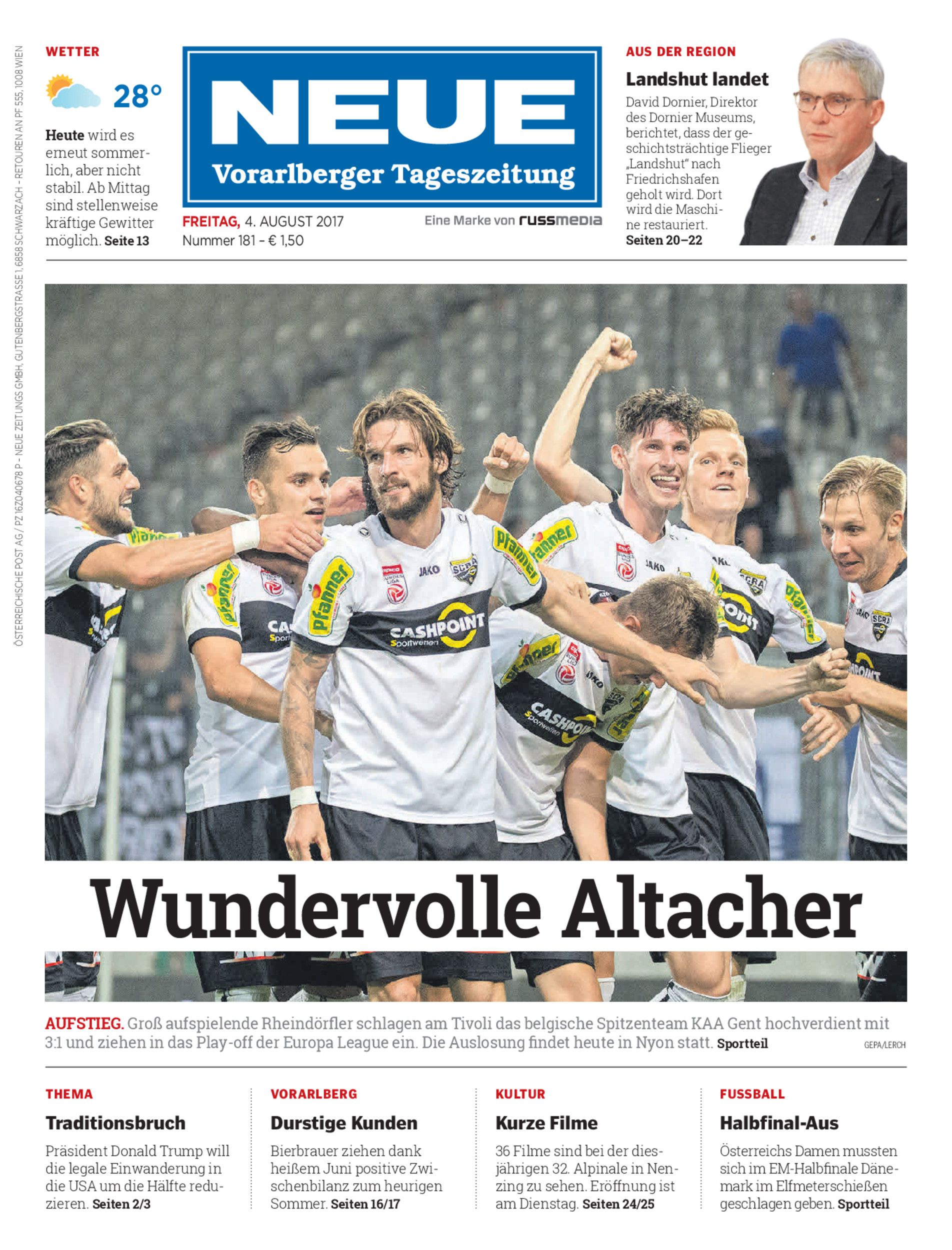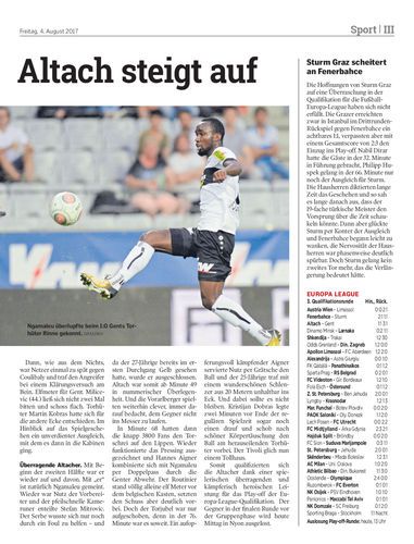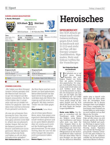 Spielbericht. Der SCR Altach gewinnt nach einer Galavorstellung gegen KAA Gent in Innsbruck mit 3:1 (1:1) und steht im Play-off der Europa-League-Qualifikation. Ngamaleu, Nutz und Dobras treffen für die Vorarlberger.