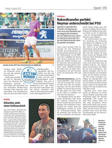 Spaniens Liga hatte den Transfer von Neymar gestern erst noch blockiert und verweigerte die Annahme der 222 Millionen Euro. Doch am Abend konnten die Pariser den Rekordtransfer dann als perfekt vermelden.