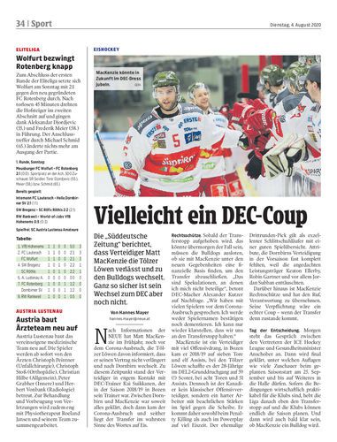 Die „Süddeutsche Zeitung“ berichtet, dass Verteidiger Matt MacKenzie die Tölzer Löwen verlässt und zu den Bulldogs wechselt. Ganz so sicher ist sein Wechsel zum DEC aber noch nicht.