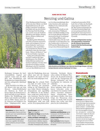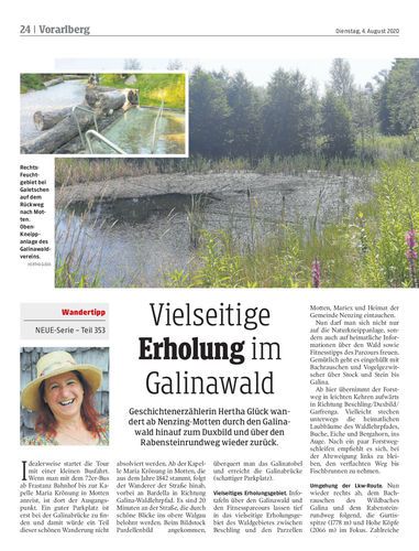 Geschichtenerzählerin Hertha Glück wandert ab Nenzing-Motten durch den Galinawald hinauf zum Duxbild und über den Rabensteinrundweg wieder zurück.