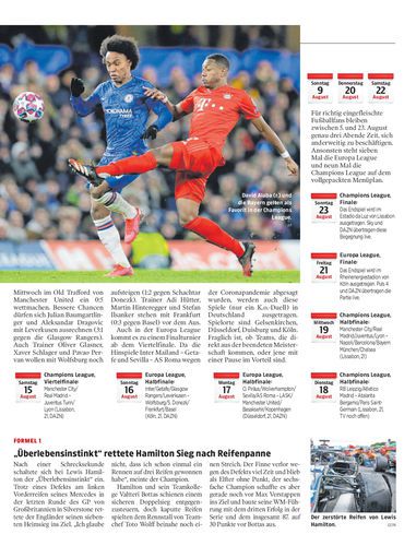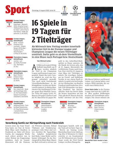 fussball. Ab Mittwoch bis zum 23. August werden die Titelträger in Champions League und Europa League ermittelt. Dafür wird der Modus verkürzt und in einer Blase in Deutschland und Portugal gespielt. Seiten 30/31 gepa (3)