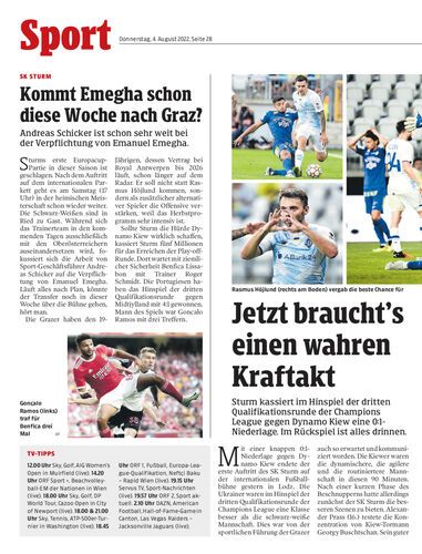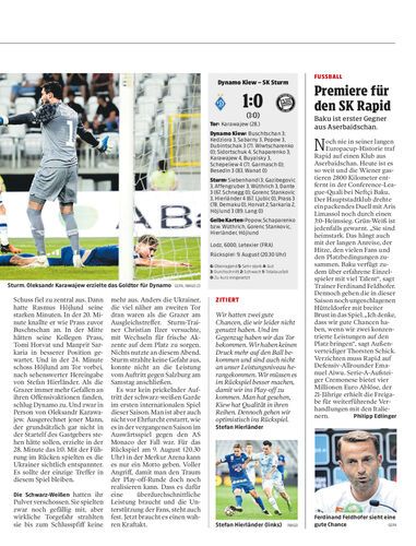 Sturm kassiert im Hinspiel der dritten Qualifikationsrunde der Champions League gegen Dynamo Kiew eine 0:1- Niederlage. Im Rückspiel ist alles drinnen.