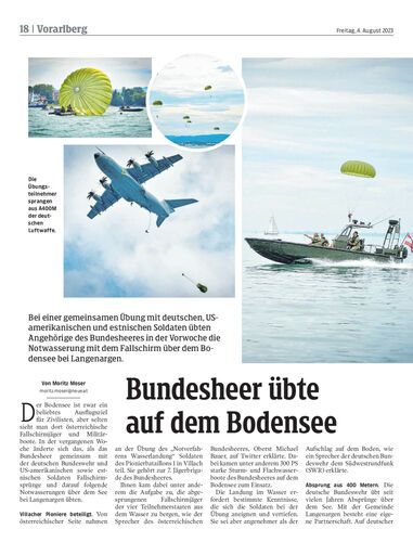 Bei einer gemeinsamen Übung mit deutschen, US-amerikanischen und estnischen Soldaten übten Angehörige des Bundesheeres in der Vorwoche die Notwasserung mit dem Fallschirm über dem Bodensee bei Langenargen.