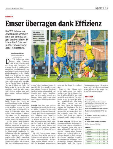 Der VfB Hohenems gewann das Schlagerspiel der Eliteliga gegen den Dornbirner SV klar mit 4:0. Stürmer Jan Stefanon gelang dabei ein Hattrick.