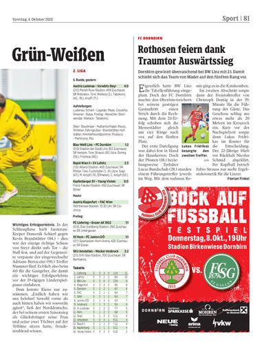 Dornbirn gewinnt überraschend bei BW Linz mit 2:1. Damit schiebt sich das Team von Mader auf den fünften Rang vor.