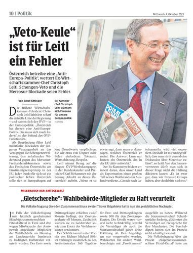 Österreich betreibe eine „Anti- Europa-Politik“, wettert Ex-Wirtschaftskammerchef Christoph Leitl. Schengen-Veto und die Mercosur-Blockade seien Fehler.