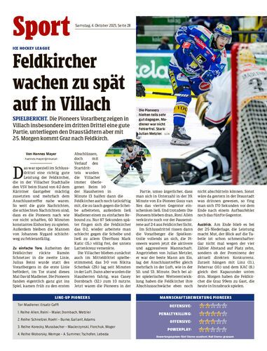 Spielbericht. Die Pioneers Vorarlberg zeigen in Villach insbesondere im dritten Drittel eine gute Partie, unterliegen den Draustädtern aber mit 2:5. Morgen kommt Graz nach Feldkirch.