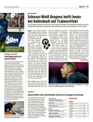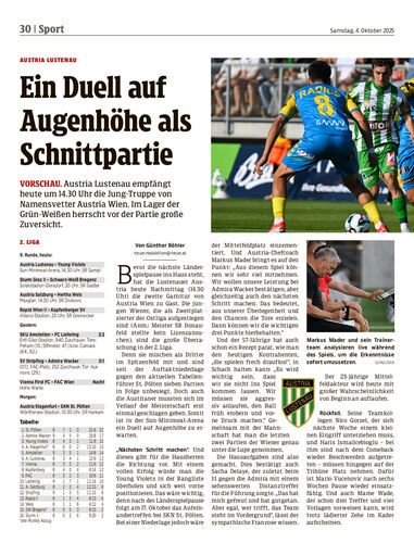 Vorschau. Austria Lustenau empfängt heute um 14.30 Uhr die Jung-Truppe von Namensvetter Austria Wien. Im Lager der Grün-Weißen herrscht vor der Partie große Zuversicht.