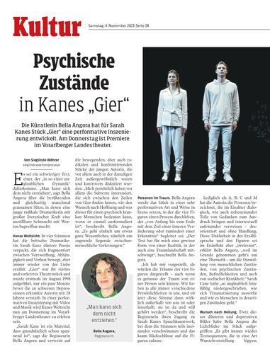 Die Künstlerin Bella Angora hat für Sarah Kanes Stück „Gier“ eine performative Inszenierung entwickelt. Am Donnerstag ist Premiere im Vorarlberger Landestheater.
