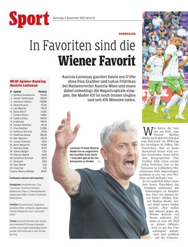 Austria Lustenau gastiert heute um 17 Uhr ohne Pius Grabher und Lukas Fridrikas bei Namensvetter Austria Wien und muss dabei unbedingt die Negativspirale stoppen. Die Mader-Elf ist noch immer sieglos und seit 476 Minuten torlos.