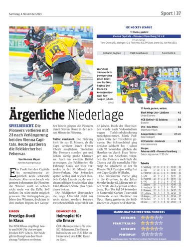 Spielbericht. Die Pioneers verlieren mit 2:3 nach Verlängerung bei den Vienna Capitals. Heute gastieren die Feldkircher bei Fehervar.