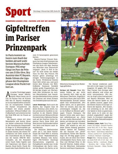 In Paris kommt es heute zum Duell der beiden aktuell wohl besten Mannschaften Europas: PSG empfängt im Parc de Princes um 21 Uhr (live, Sky Austria) den FC Bayern. Beide führen die Ligaphase der Champions League ohne Punktverlust an.