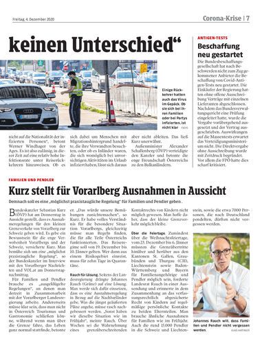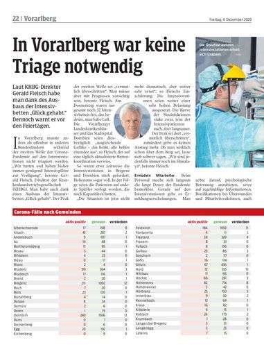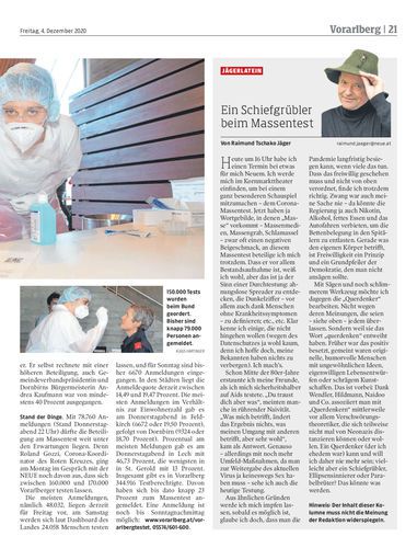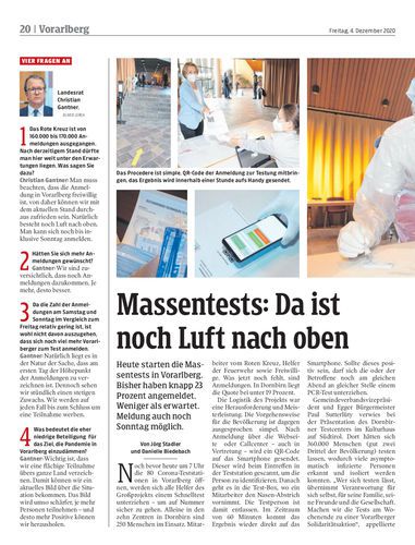 Massentests. Heute starten die flächendeckenden Corona-Tests in Vorarlberg. Bisher haben sich etwa 23 Prozent freiwillig gemeldet. Gemeindeverband und Land appellieren an Bevölkerung, sich testen zu lassen. Seiten 20/21 Hartinger