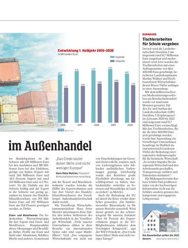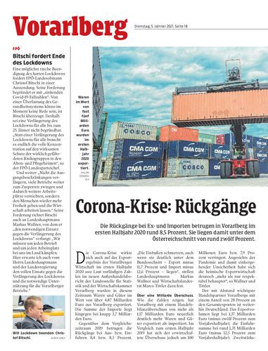 Die Rückgänge bei Ex- und Importen betrugen in Vorarlberg im ersten Halbjahr 2020 rund 8,5 Prozent. Sie liegen damit unter dem Österreichschnitt von rund zwölf Prozent.