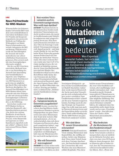 Mutationen. Was Experten erwartet haben, hat sich nun bestätigt: Zwei mutierte Varianten des Coronavirus wurden nun auch in Österreich nachgewiesen. Höhere Infektiosität könnte die Viruseindämmung erschweren. Von Sonja Krause und Maria Schaunitzer