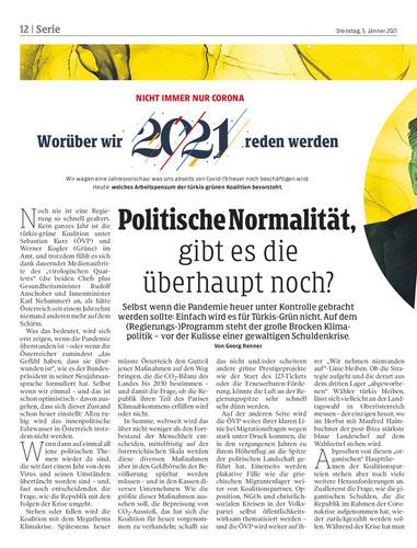 Selbst wenn die Pandemie heuer unter Kontrolle gebracht werden sollte: Einfach wird es für Türkis-Grün nicht. Auf dem (Regierungs-)Programm steht der große Brocken Klimapolitik – vor der Kulisse einer gewaltigen Schuldenkrise. Von Georg Renner