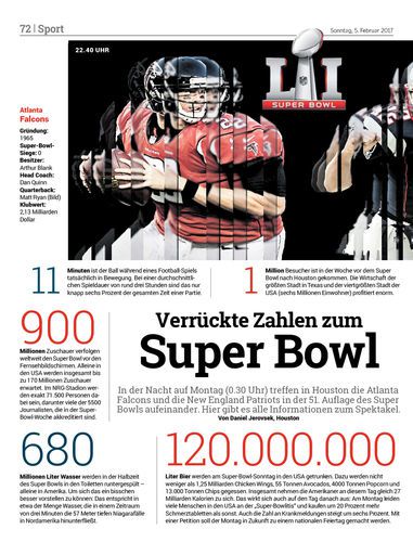 In der Nacht auf Montag (0.30 Uhr) treffen in Houston die Atlanta Falcons und die New England Patriots in der 51. Auflage des Super Bowls aufeinander. Hier gibt es alle Informationen zum Spektakel. Von Daniel Jerovsek, Houston