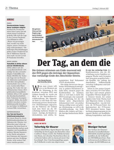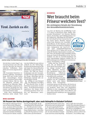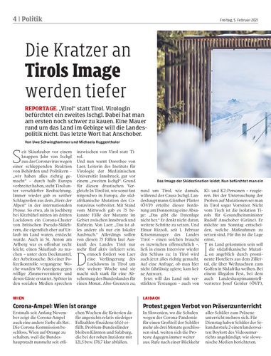 „Virol“. Virologin warnt vor einem „zweiten Ischgl“ und fordert eine Abschottung des Bundeslands. Die Tiroler Landespolitik wehrt sich dagegen. Das letzte Wort hat aber Gesundheitsminister Rudolf Anschober. Seiten 4/5 APA
