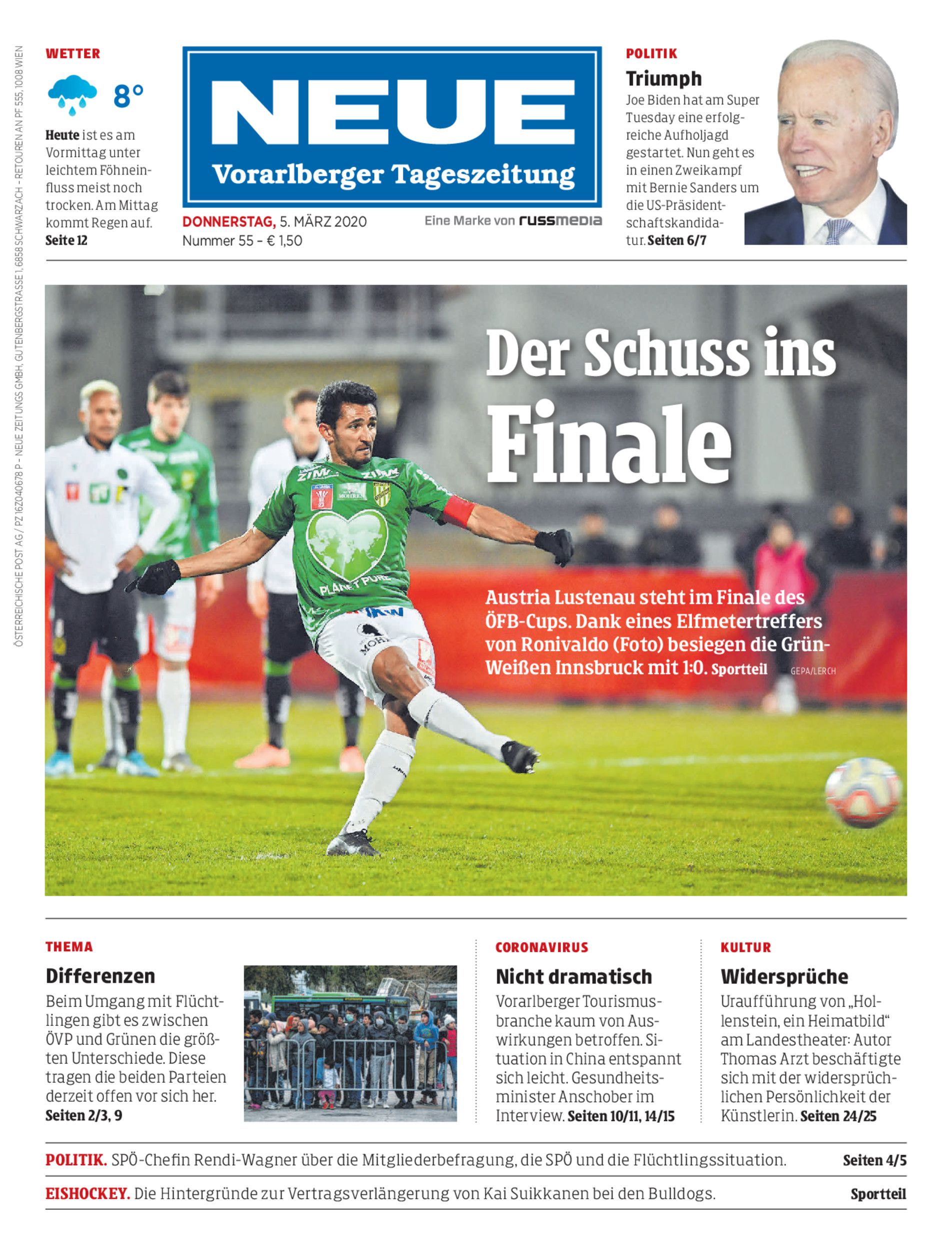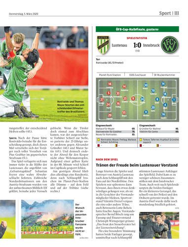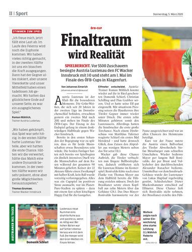 Spielbericht. Vor 5500 Zuschauern besiegte Austria Lustenau den FC Wacker Innsbruck mit 1:0 und steht am 1. Mai im Finale des ÖFB-Cups in Klagenfurt.