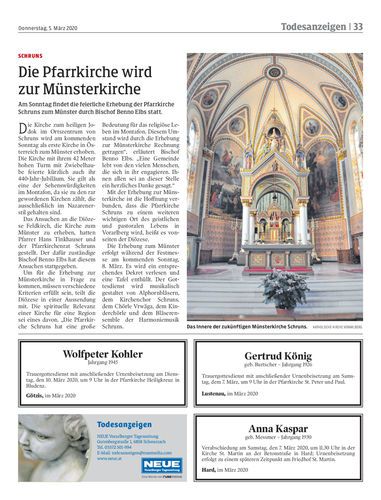 Am Sonntag findet die feierliche Erhebung der Pfarrkirche Schruns zum Münster durch Bischof Benno Elbs statt.