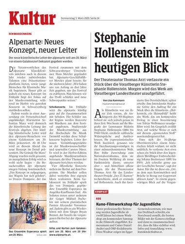 Der Theaterautor Thomas Arzt verfasste ein Stück über die Vorarlberger Künstlerin Stephanie Hollenstein. Morgen wird das Werk am Vorarlberger Landestheater uraufgeführt.