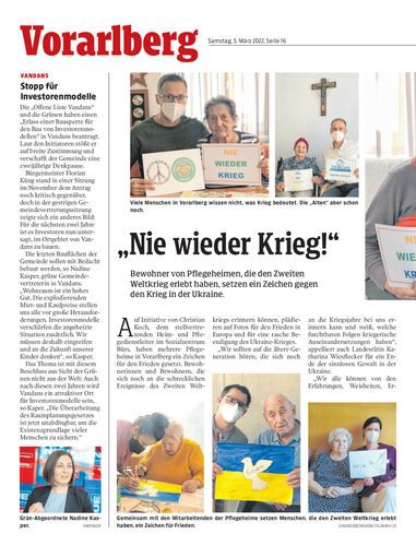 Bewohner von Pflegeheimen, die den Zweiten Weltkrieg erlebt haben, setzen ein Zeichen gegen den Krieg in der Ukraine.
