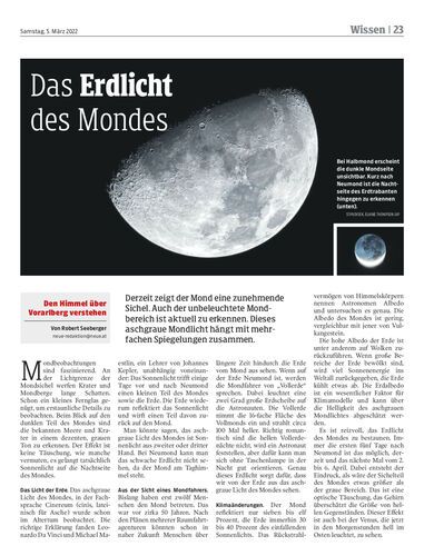Derzeit zeigt der Mond eine zunehmende Sichel. Auch der unbeleuchtete Mondbereich ist aktuell zu erkennen. Dieses aschgraue Mondlicht hängt mit mehrfachen Spiegelungen zusammen.