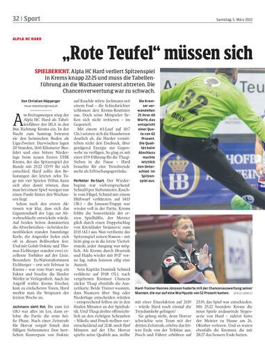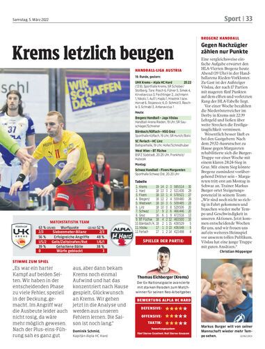 Spielbericht. Alpla HC Hard verliert Spitzenspiel in Krems knapp 22:25 und muss die Tabellenführung an die Wachauer vorerst abtreten. Die Chancenverwertung war zu schwach.