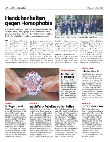 Nach einem tätlichen Angriff auf ein homosexuelles Paar während eines Spaziergangs in Arnheim solidarisieren sich nun Sportler, Polizisten oder Politiker mit den Opfern. Sechs Tatverdächtige wurden indes festgenommen.