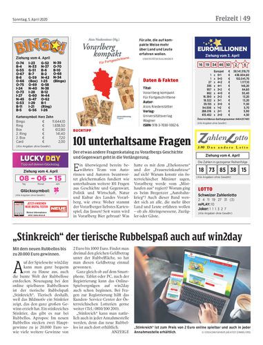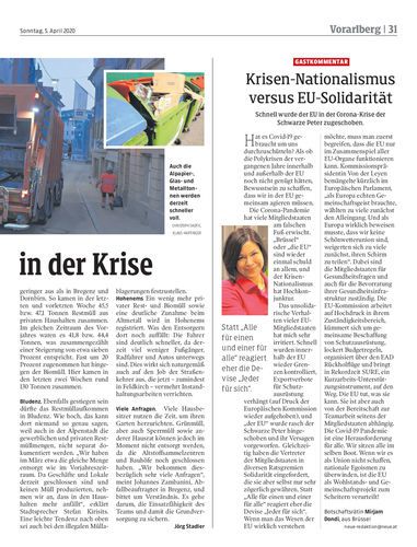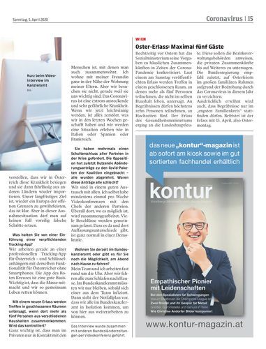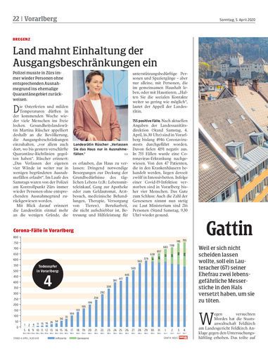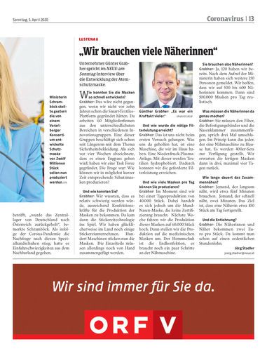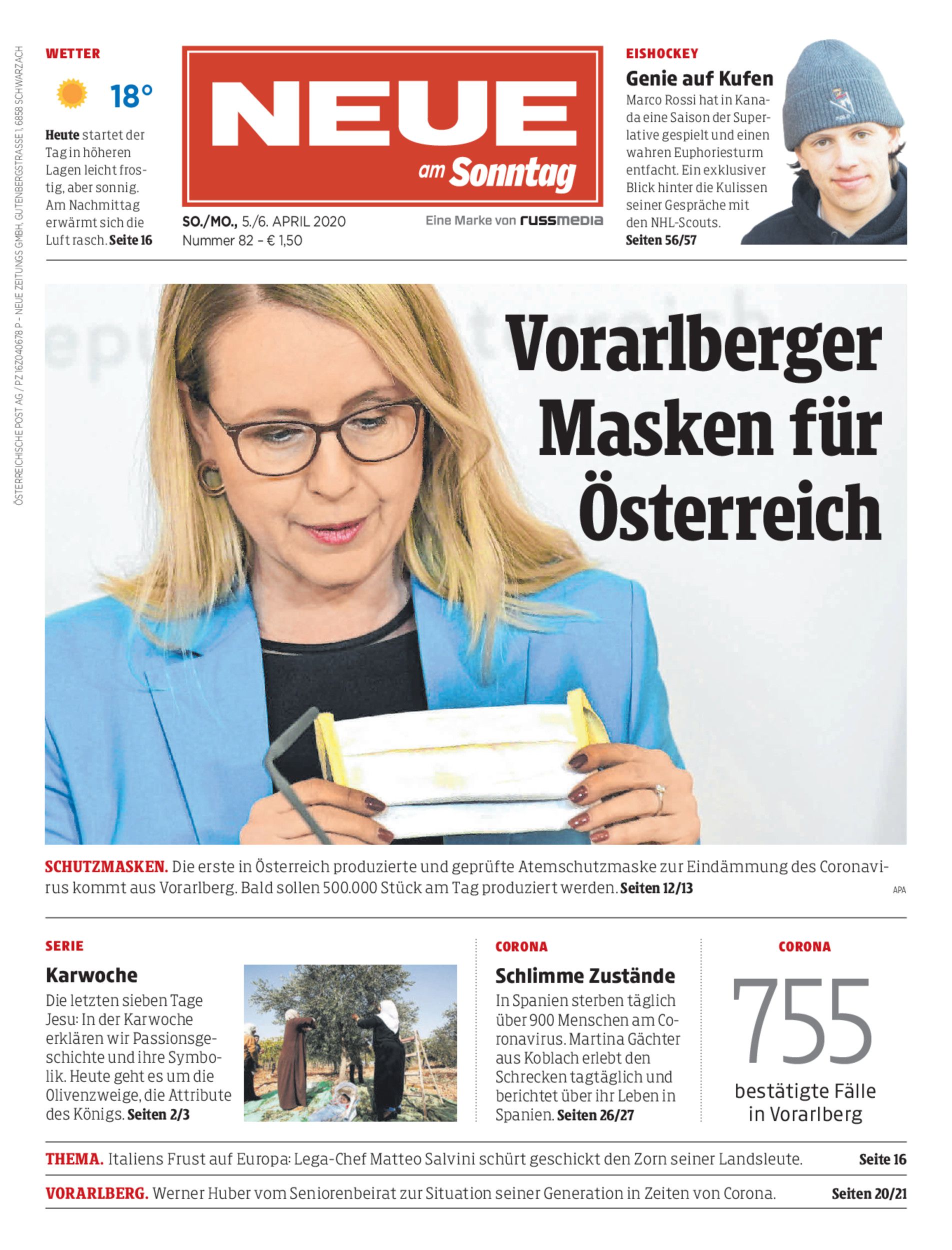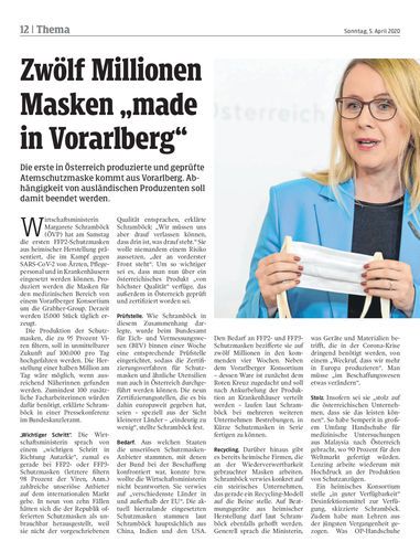 Schutzmasken. Die erste in Österreich produzierte und geprüfte Atemschutzmaske zur Eindämmung des Coronavirus kommt aus Vorarlberg. Bald sollen 500.000 Stück am Tag produziert werden. Seiten 12/13 APA