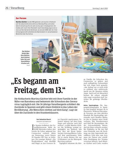 Die Koblacherin Martina Gächter lebt mit ihrer Familie in der Nähe von Barcelona und bekommt die Schrecken des Coronavirus tagtäglich mit. Die 34-jährige Vorarlbergerin schildert die Zustände in Spanien und gibt einen Einblick in das Leben der Bevölkerung: „Die Menschen sterben auf dem Gang“, sagt sie über die Zustände in den Krankenhäusern.