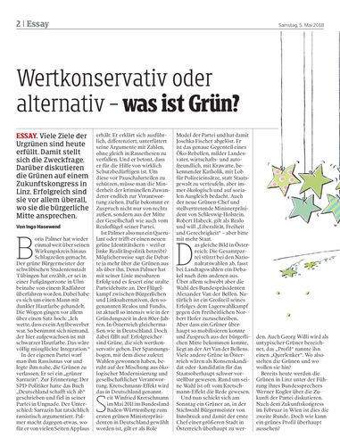 ESSAY. Viele Ziele der Urgrünen sind heute erfüllt. Damit stellt sich die Zweckfrage. Darüber diskutieren die Grünen auf einem Zukunftskongress in Linz. Erfolgreich sind sie vor allem überall, wo sie die bürgerliche Mitte ansprechen. Von Ingo Hasewend