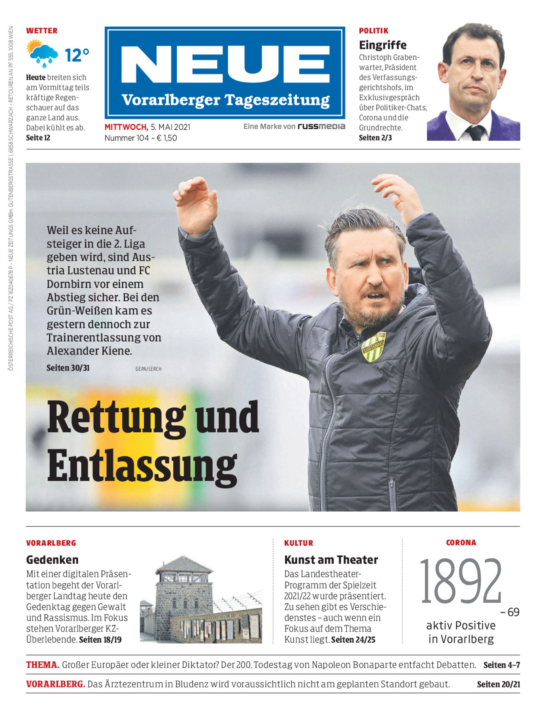 Weil es keine Aufsteiger in die 2. Liga geben wird, sind Austria Lustenau und FC Dornbirn vor einem Abstieg sicher. Bei den Grün-Weißen kam es gestern dennoch zur Trainerentlassung von Alexander Kiene.